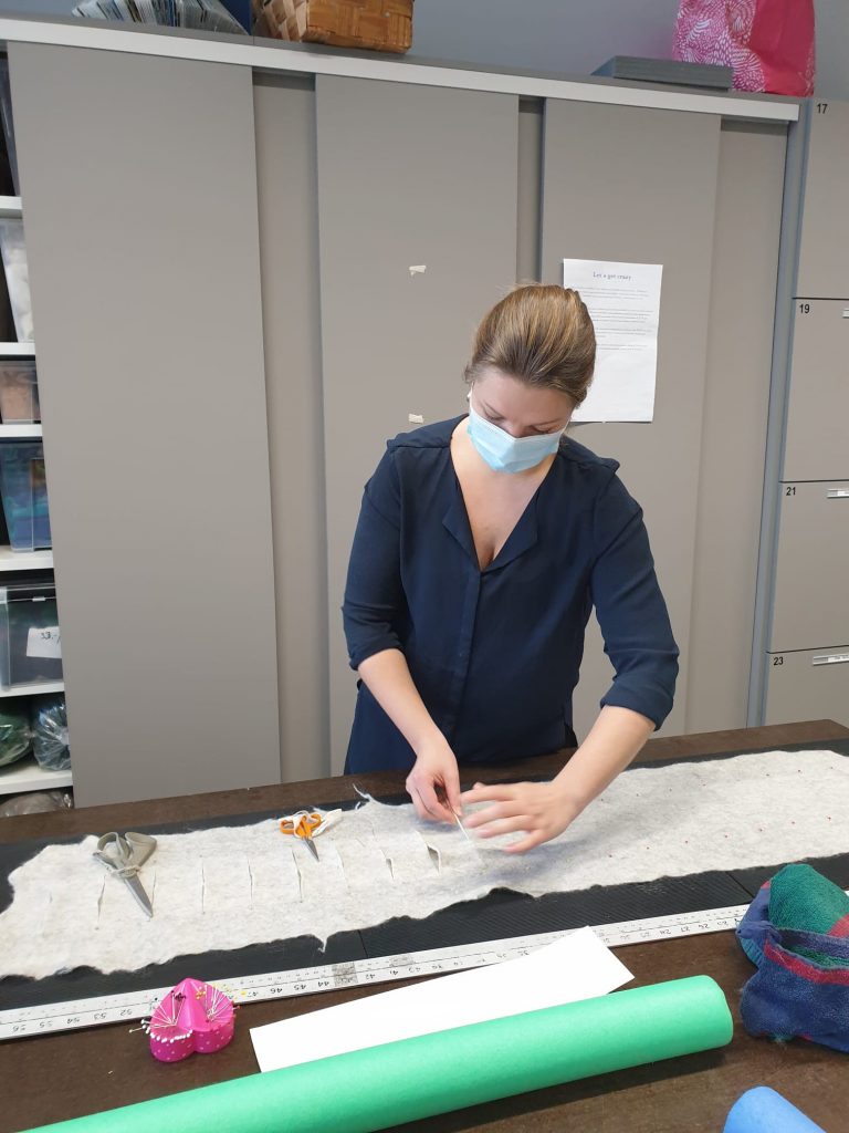 Varjostinkankaan kaksikerroksinen rakenne on saatu aikaan laittamalla huovutuksen ajaksi muovi villakerrosten väliin. Pintakerrosta on leikattu auki ja ommeltu, niin että alempi kerros tulee näkyviin.