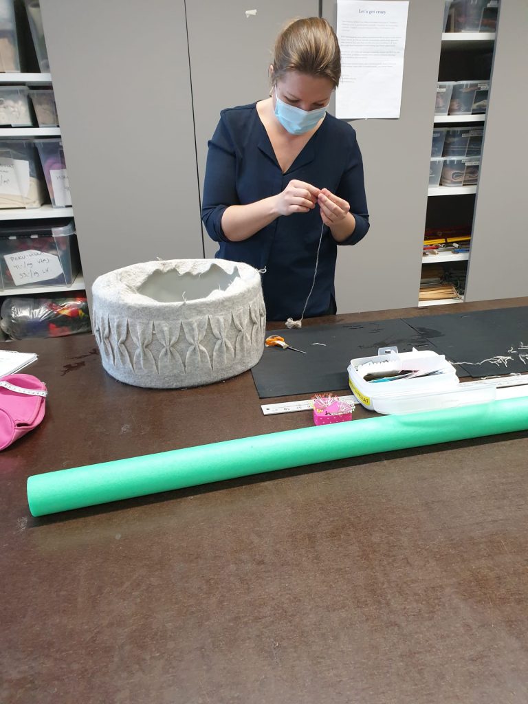 Varjostinkangas kuivatettiin muotoon vanhan kankaan päälle ommeltuna.
