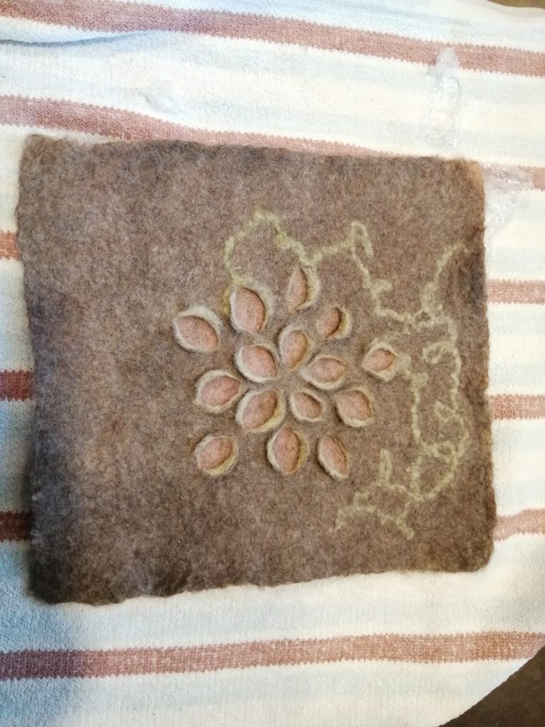 Esihuopaan neulattu kuviointi ja märkähuovuttamalla muotoon huovutus.