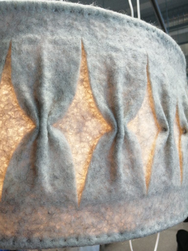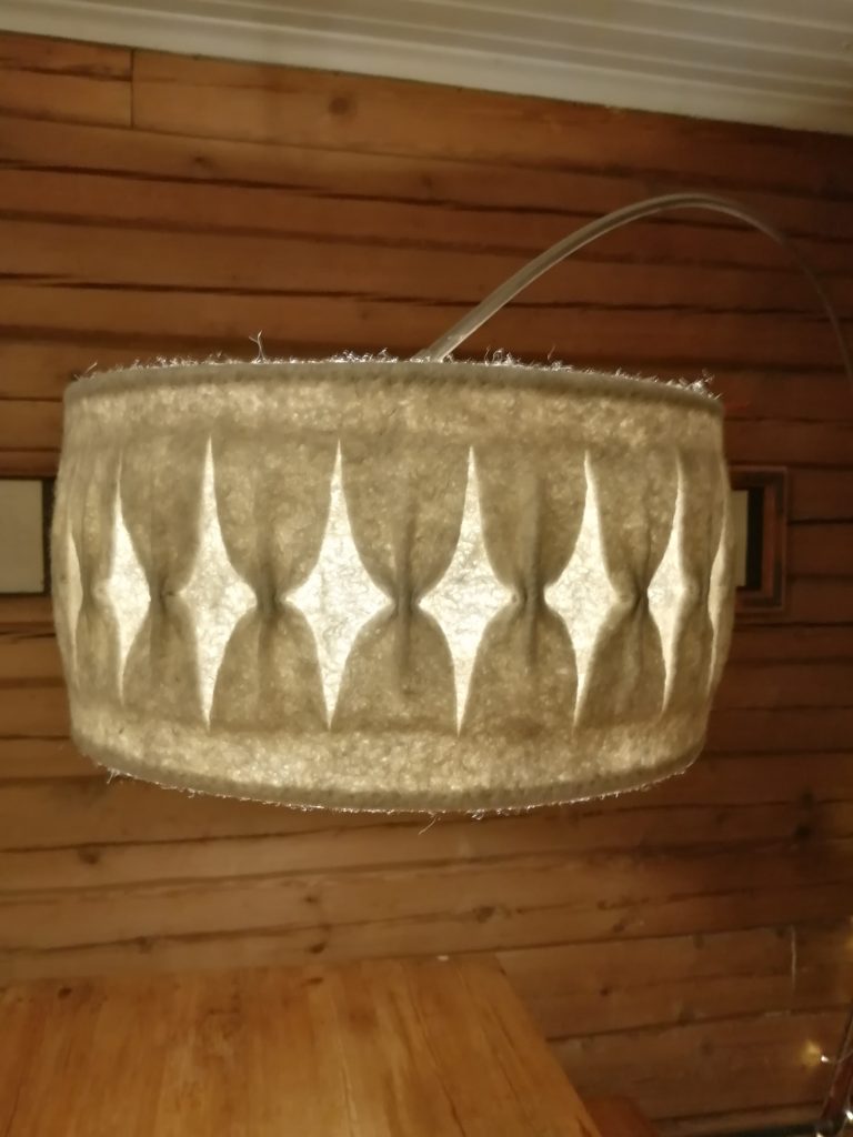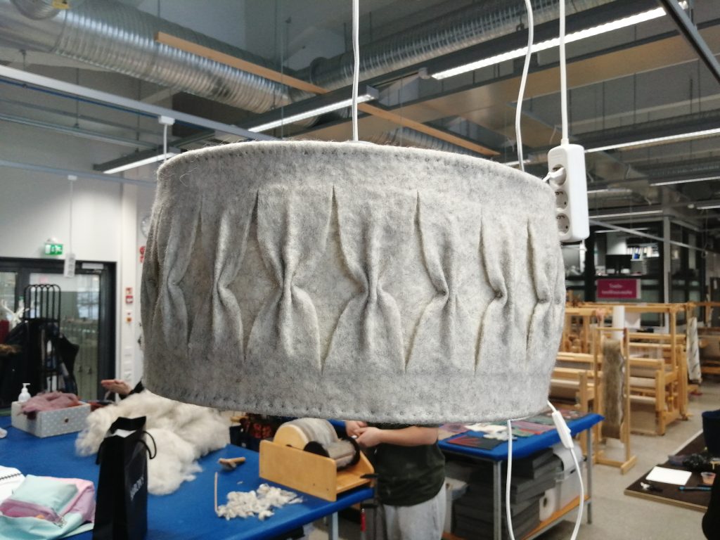Kurssin päätyöksi tein olemassa olevaan valaisimeen uuden varjostimen, sekä koristetyynynpäällisen omien lampaideni villasta. Halusin tuoda varjostimessa esille villan rakenteen valon avulla. Tyynynpäällinen on tehty samasta villasta, kuin valaisin ja pintaan on yhdistetty käsinkehrättyä taidelankaa.