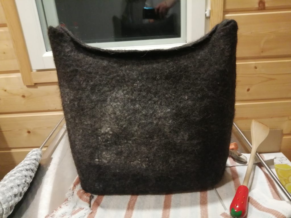 Kurssin lopuksi halusin kokeilla huovuttaa kaavalla olkalaukun ja kokeilla samalla osien liittämistä. Eli tässä tapauksessa liitettävä osa oli laukun kantohihna. Laukun villa on siskoni suomenlampaan Jandan villaa. Janda on väriltään harmaantuva mustapanda ja luonteeltaan oikea halilammas. Laukussa on käytetty kaikkia värejä mitä Jandan villassa esiintyy.