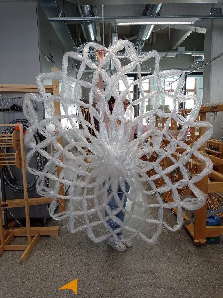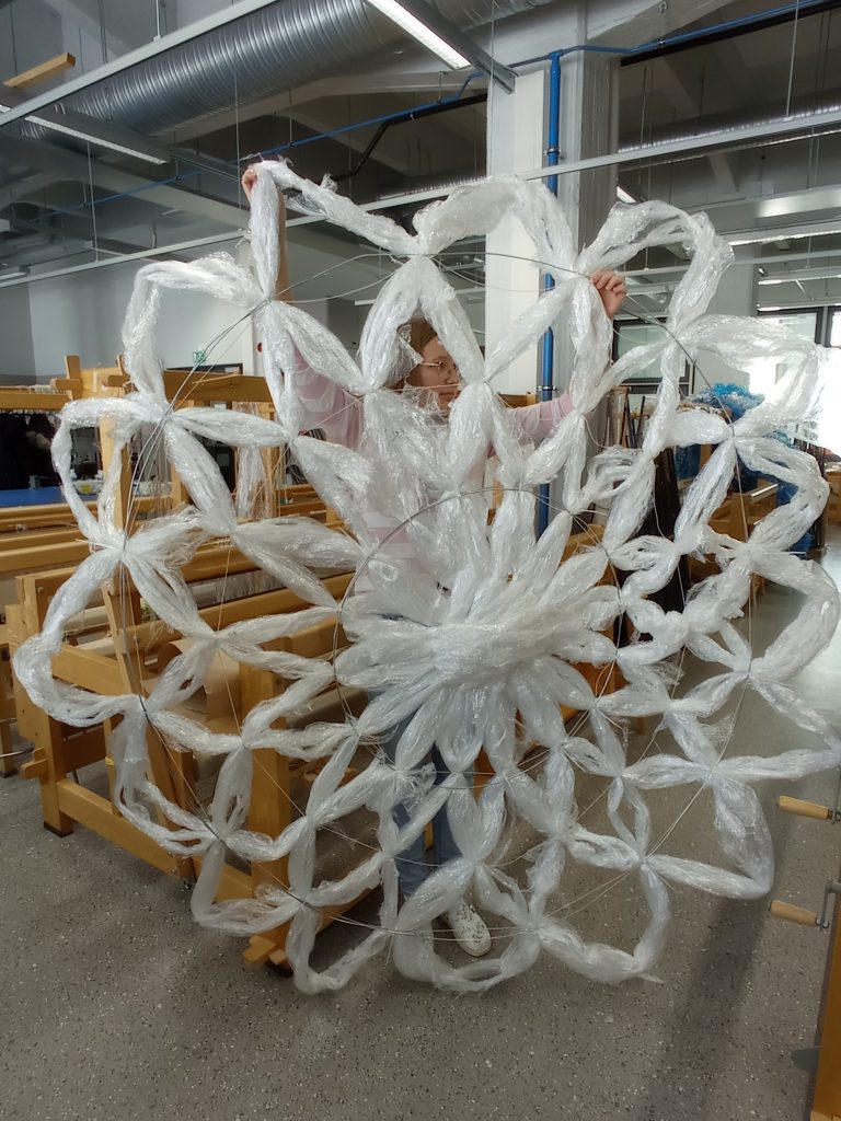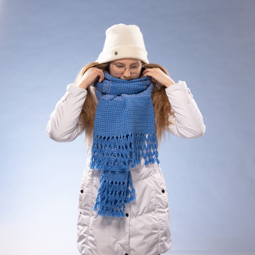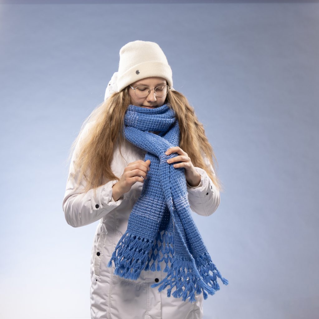Luokkatoverini Eeva halusi kuvata kutomaansa huivia mutta ei itse halunnut mennä kameran eteen joten minä suostuin malliksi. Kuvista tuli oikein onnistuneita.