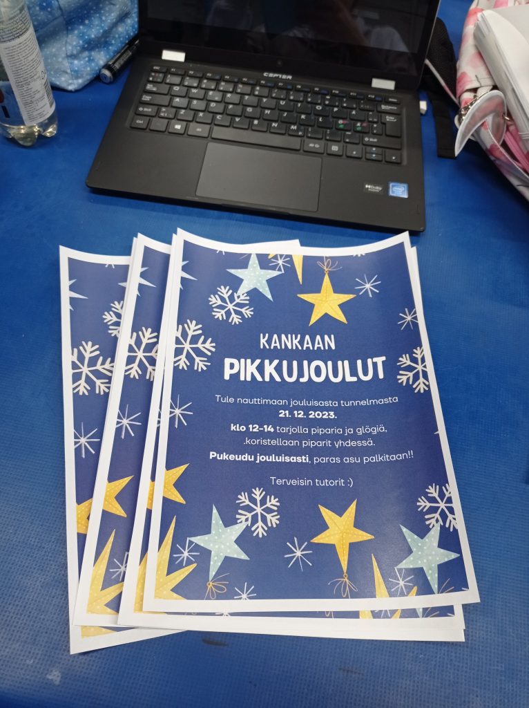 21.12. pidimme kankaan pikkujoulut. Ohjelmaan kuului mm. pipareiden koristelua, korttipaja ja musiikkia. Sai myös pukeutua jouluisasti ja parhain asu palkittiin konvehtirasialla.