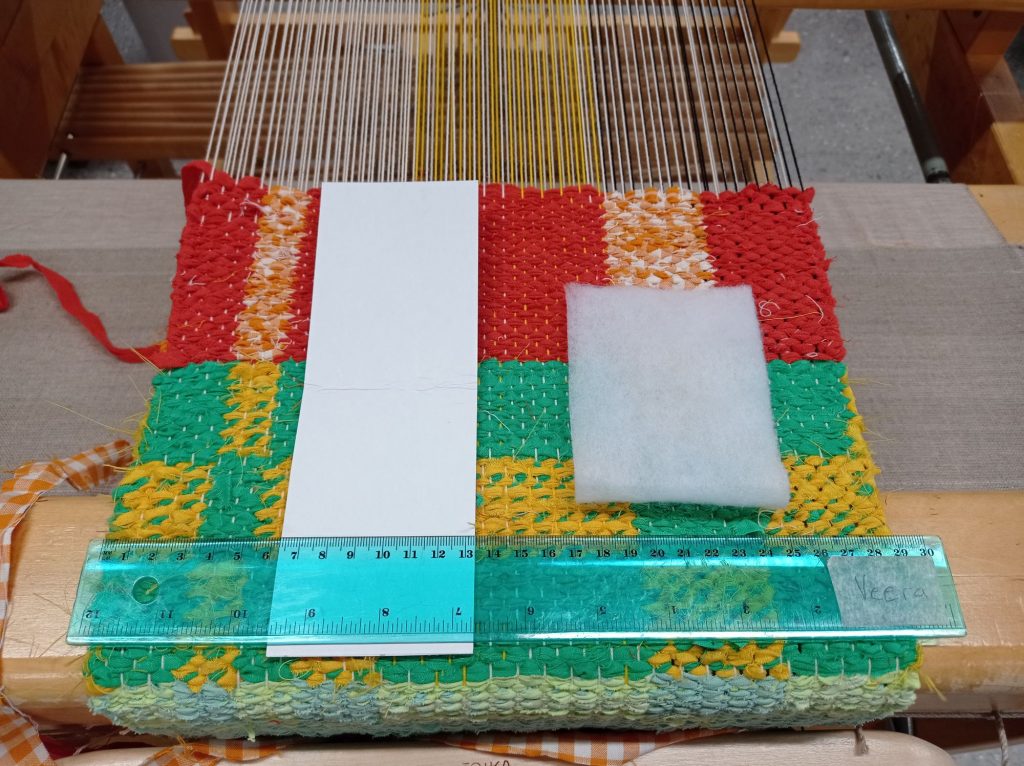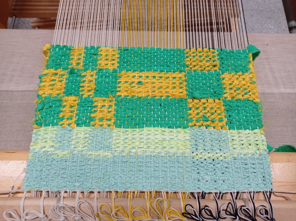 Aloitin kutomisen ja kangas ei sitoutunut oikein. Kankaasta olisi pitänyt tulla kaksi puoleinen ja niin että joka toiseen ruutuun syntyy tasku. Virhe löytyi kankaan sidonta piirroksesta, muutama ruutu oli mennyt väärin päin.