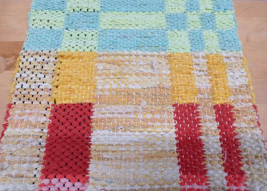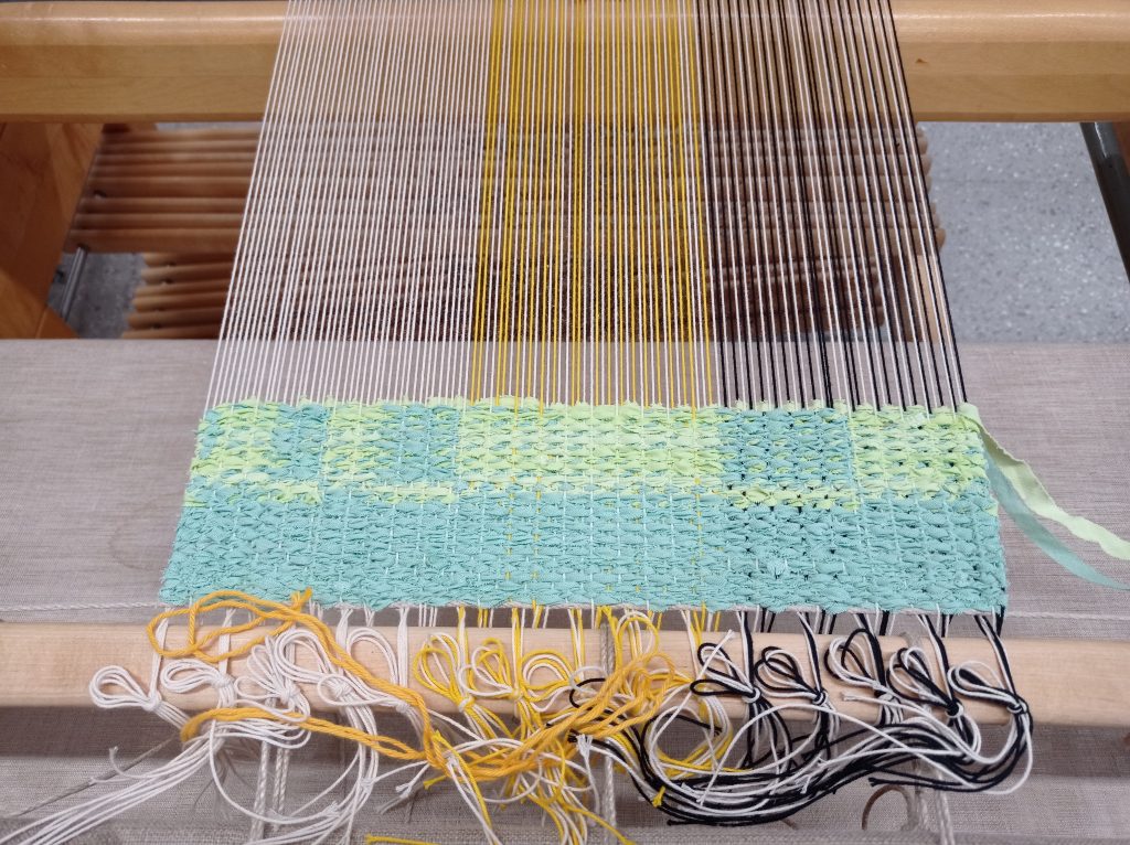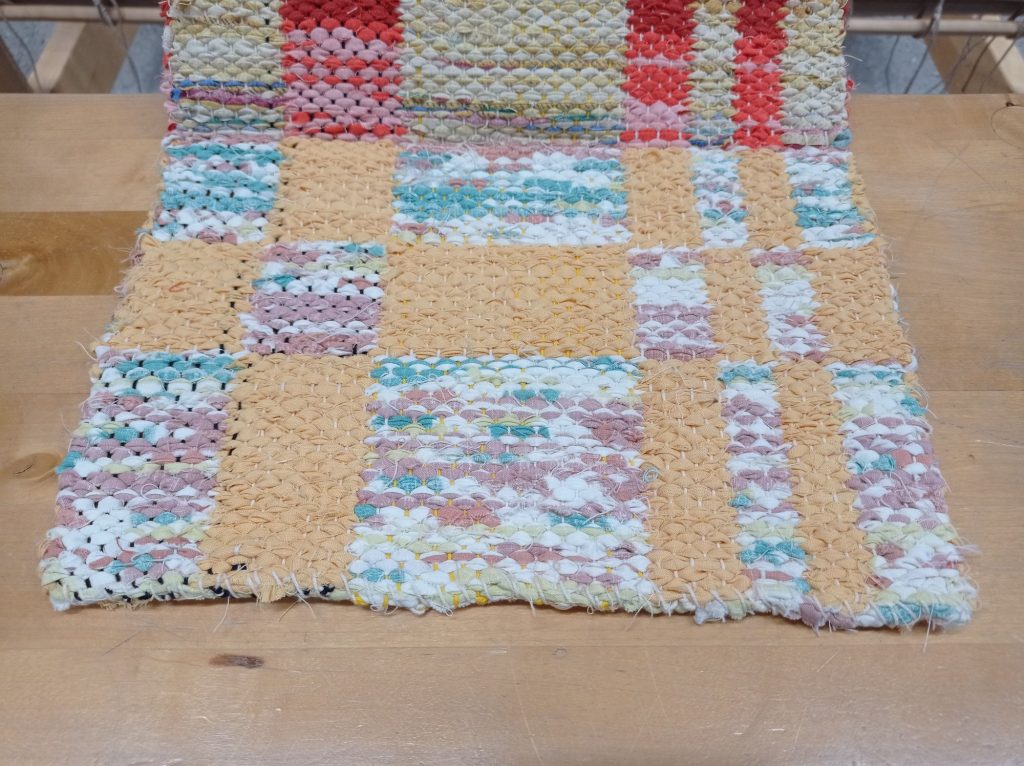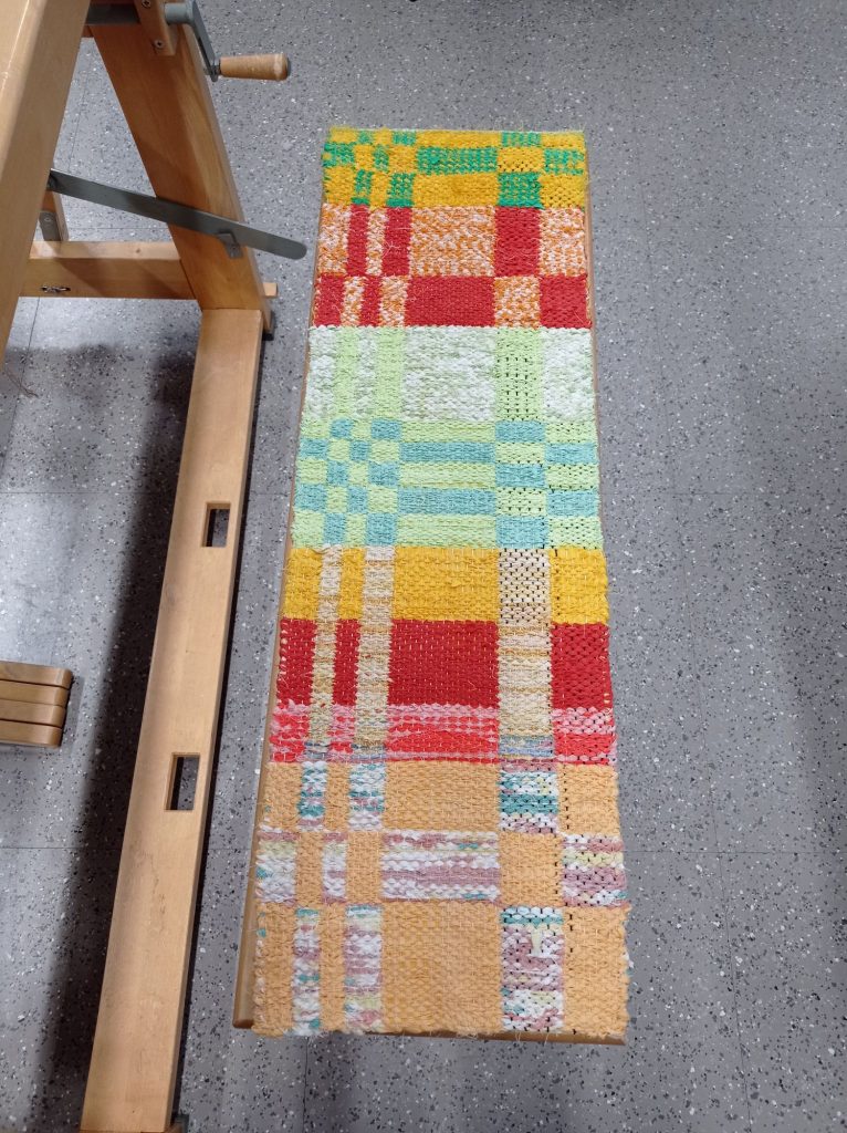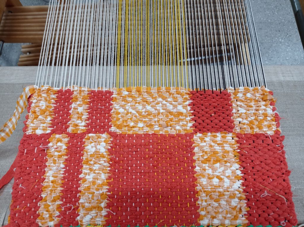 Opettaja ehdotti että päärmeen voisi kutoa palttinasidoksella. Ontelosidoksella kudottuna siitä tuli hieman liian paksu. Lisäsin päärmeeseen myös ohutta räsykudetta jotta siitä tulisi hieman tukevampi. Ohuempina lankoina käytin puuvillaa ja pellavaa.