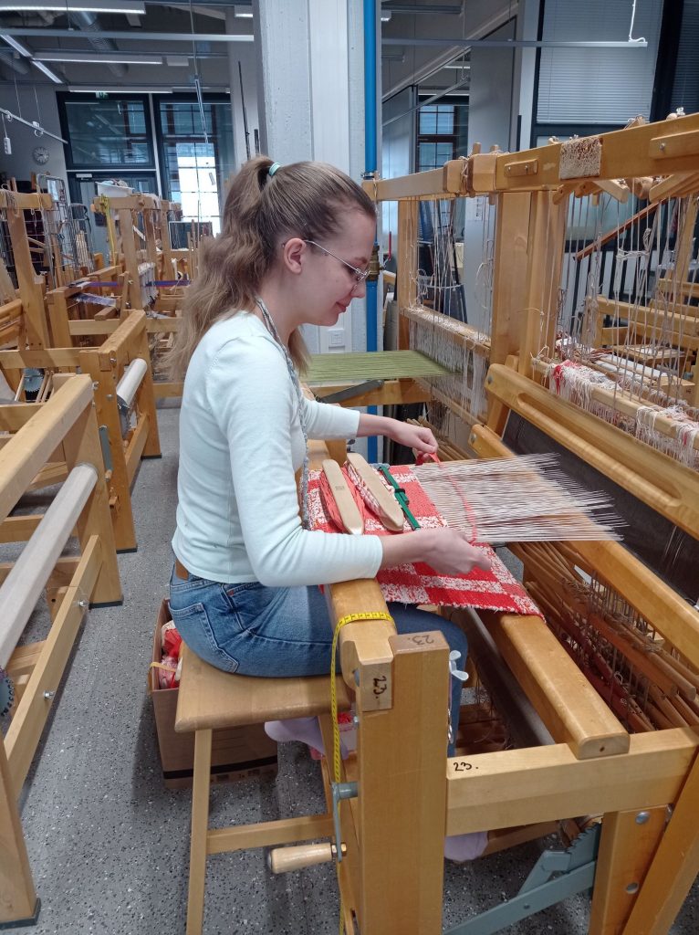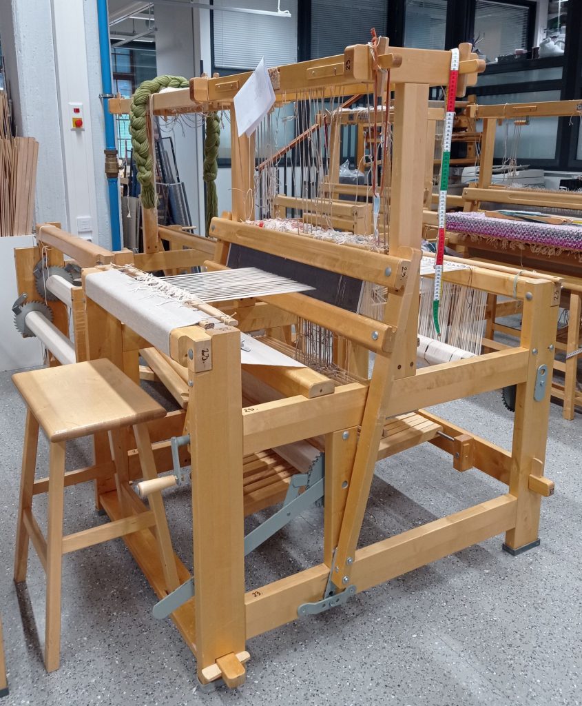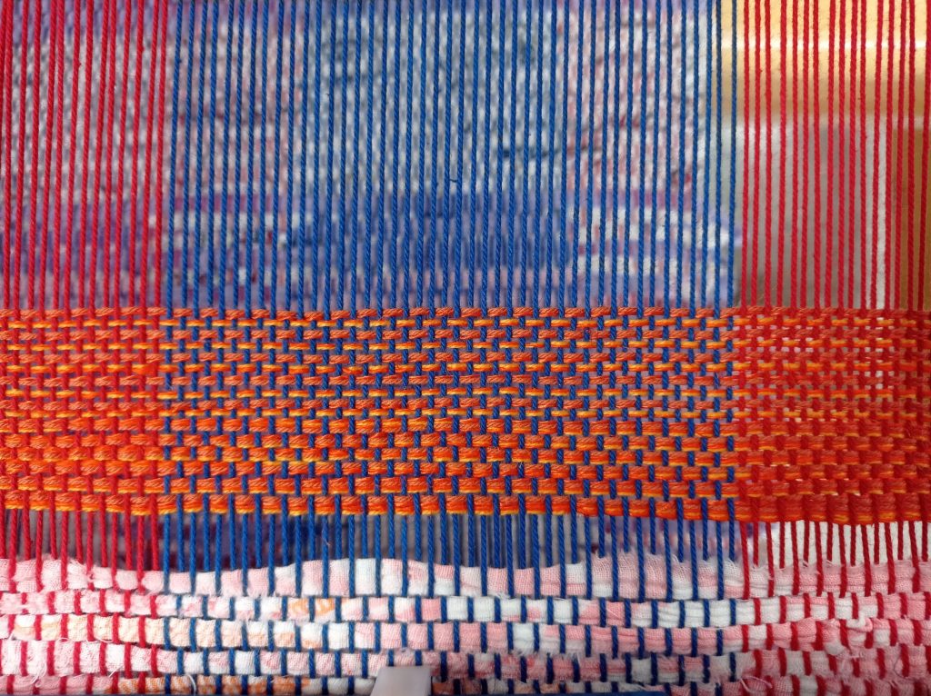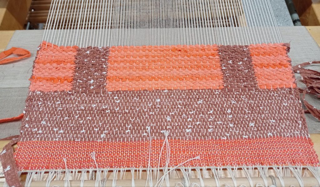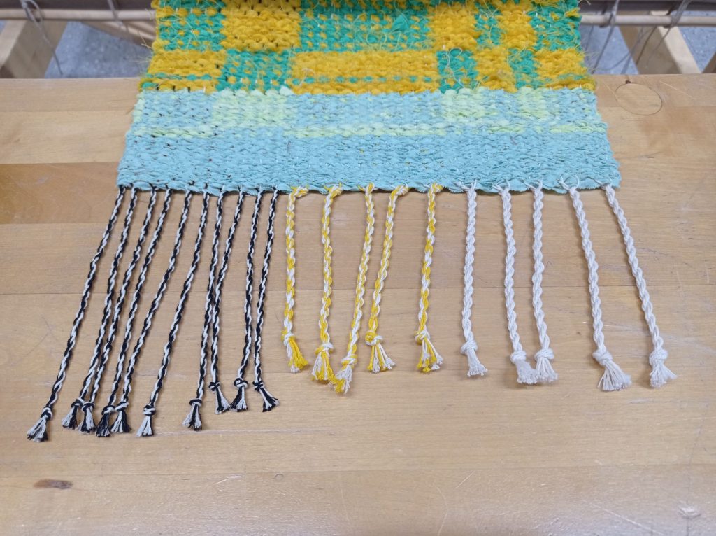 Opettaja ehdotti että päärmeen voisi kutoa palttinasidoksella. Ontelosidoksella kudottuna siitä tuli hieman liian paksu. Lisäsin päärmeeseen myös ohutta räsykudetta jotta siitä tulisi hieman tukevampi. Ohuempina lankoina käytin puuvillaa ja pellavaa.