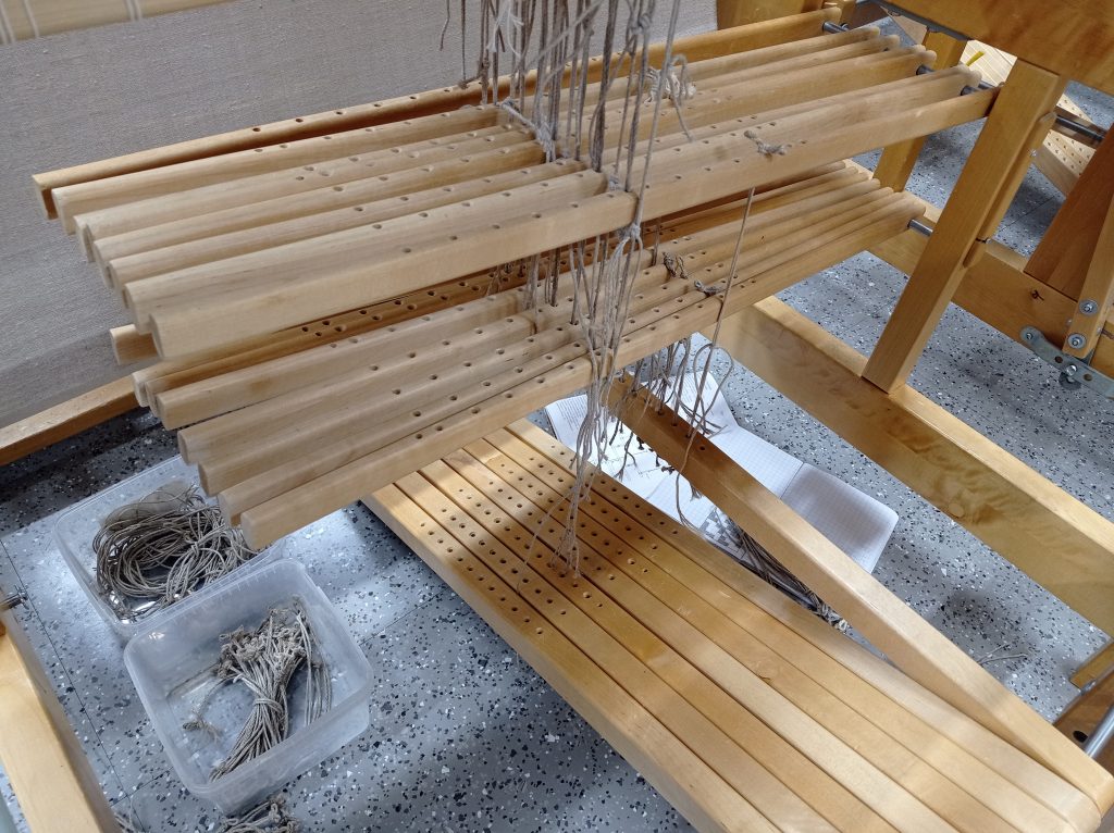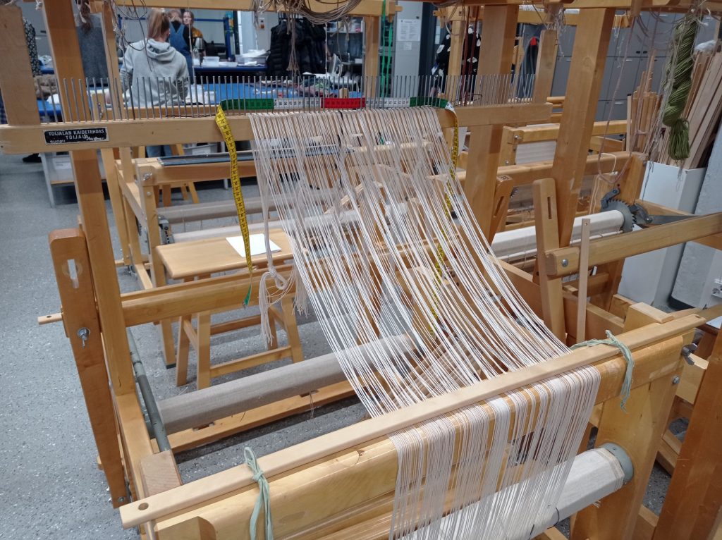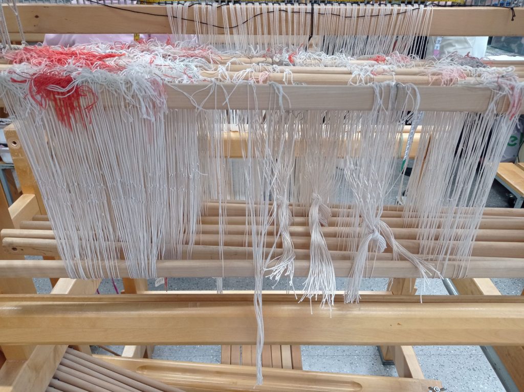 Loimen rakentamista ja kuva valmiista loimesta kangaspuissa.