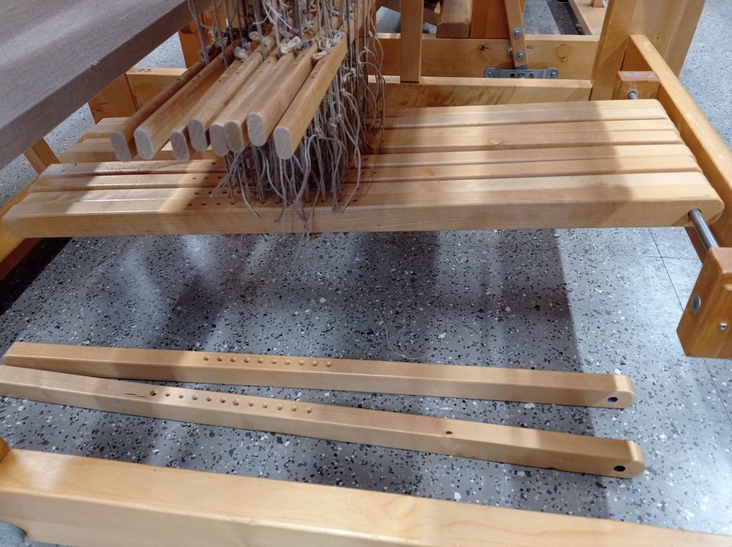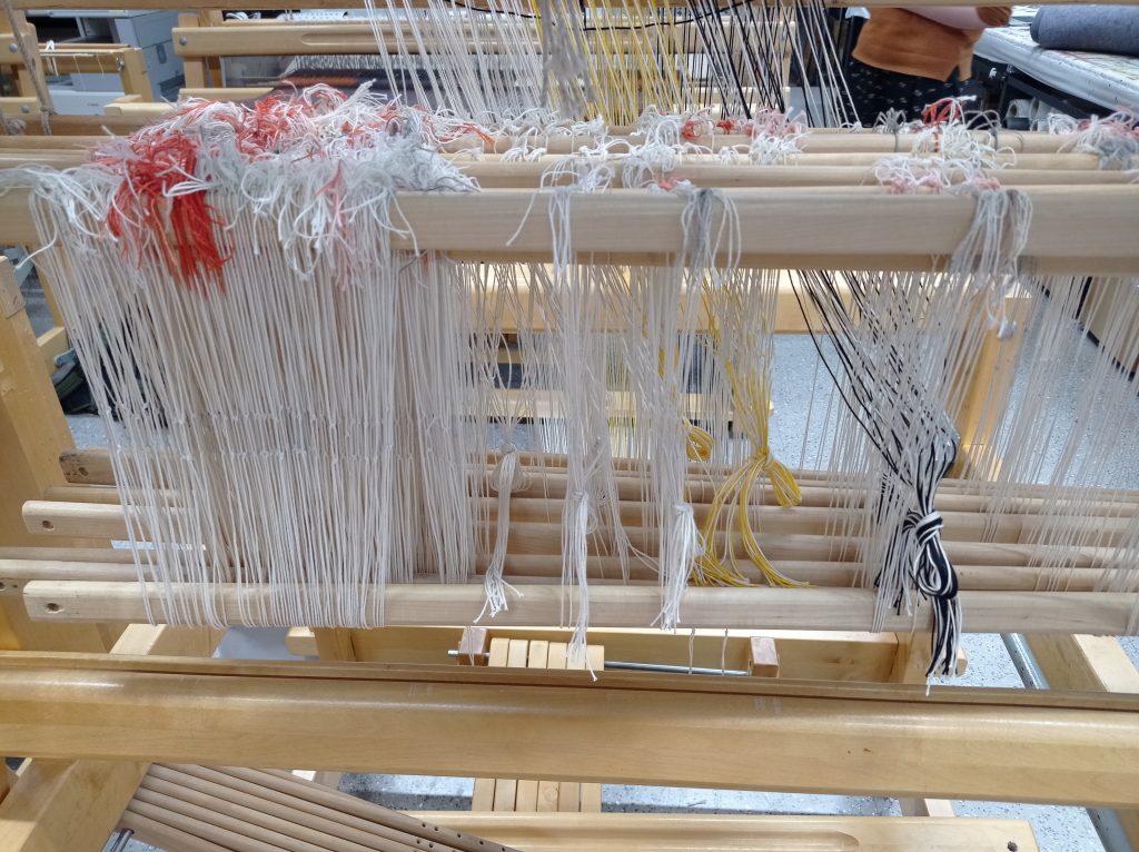Lisäsin puihin vielä kahdet polkuset jotta saisin kudottua palttinaa päärmettä varten. Polkusia tuli lopulta 10kpl.Värien valitseminen ja sommittelu oli kaikkein haastavinta.Aloitin näillä väreillä, purin sen koska en ollut yhtään tyytyväinen.