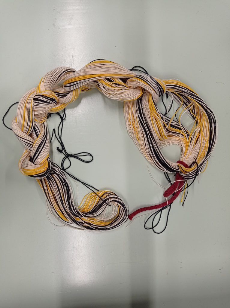 Loimen laskujapiirroksiakäytin loimeen keltaista, valkoista ja mustaa 12-säikeistä kalalankaaniisintääpolkusten sitomista