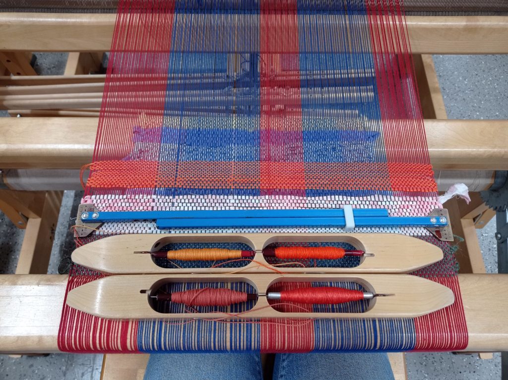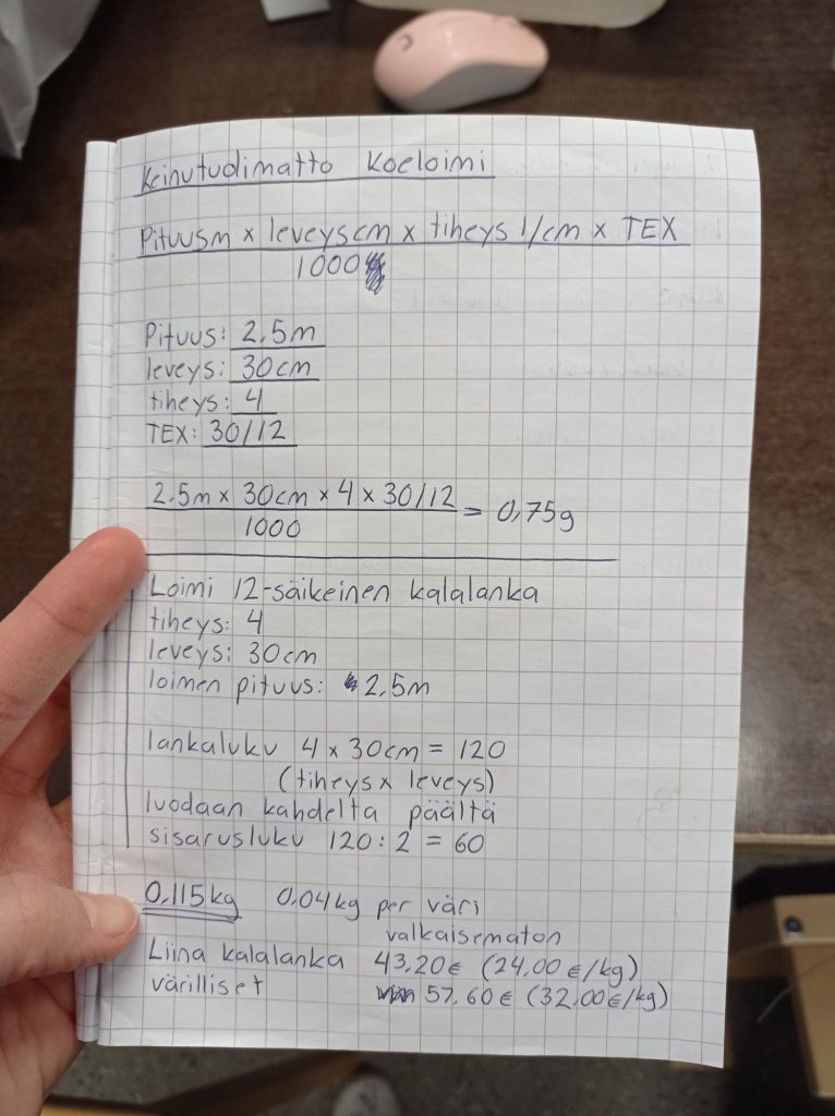 Valmistin 2,5m pitkän ja 30cm leveän koe loimen, jotta saan harjoitusta haastavan sidonnan kanssa. Pääsen myös testailemaan erilaisia väri ja ruutu yhdistelmiä.