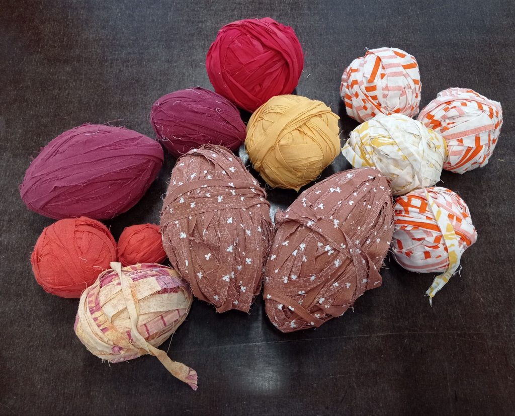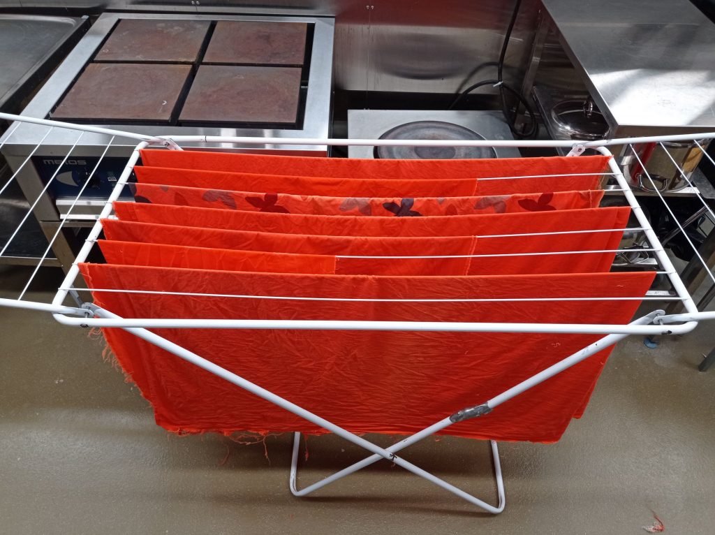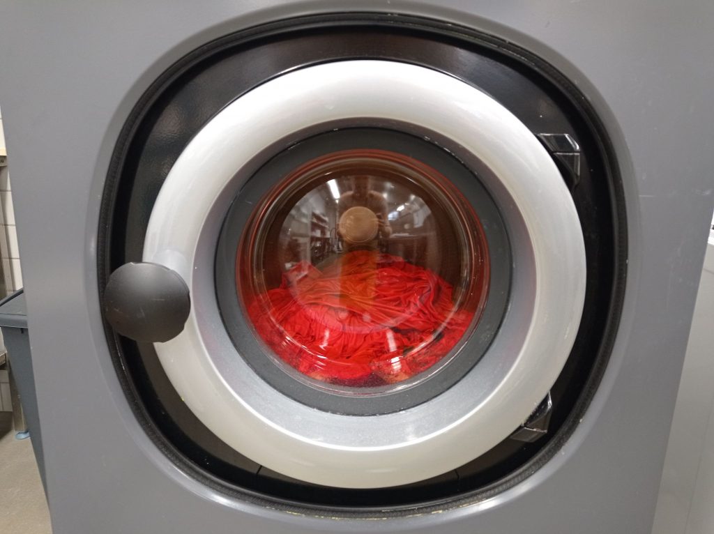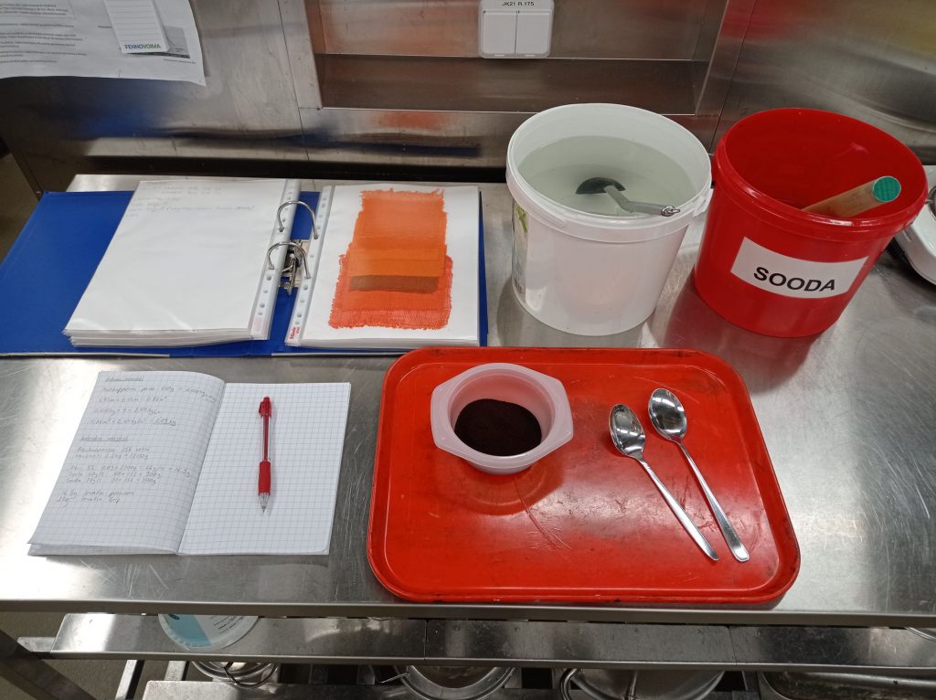 Asiakkaan toiveena oli oranssi ja sen väristä kudetta tai kangasta ei löytynyt. Opettaja keksi, että voin värjätä kankaita pesukonevärjäyksellä. Värjäys onnistui hyvin.