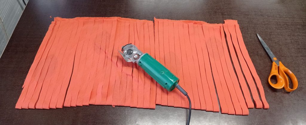 Värjätyn kankaan leikkaamista kuteeksi.