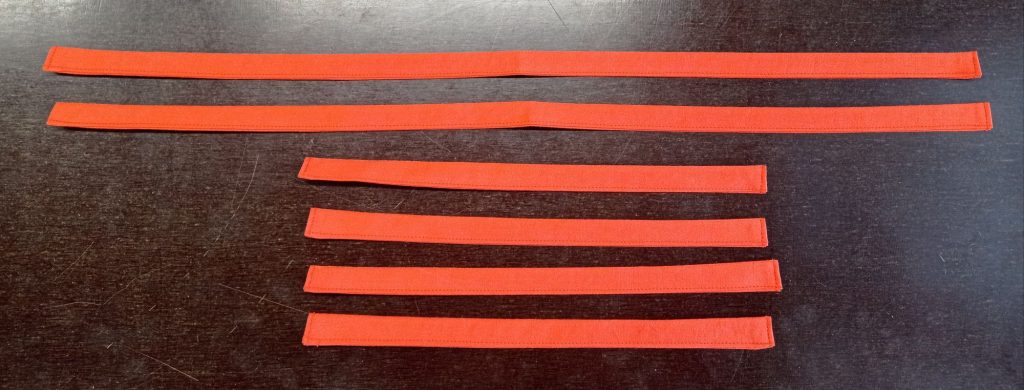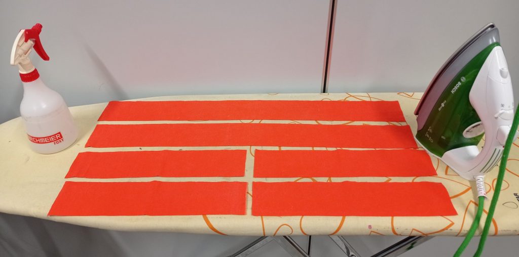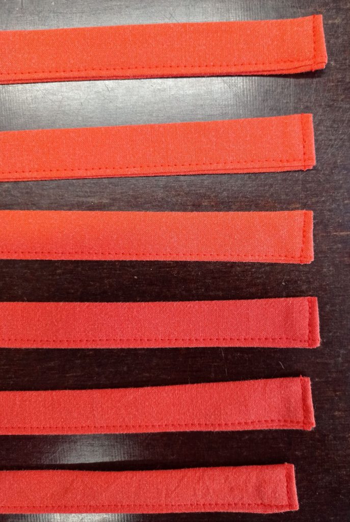 Leikatut ja silitetyt kankaat nauhoja varten.Taittelu ja ompelu oli tarkkaa puuhaa.Valmiit nauhat. Sain niistä tasalaatuiset ja sopivat täydellisesti tehtäväänsä.
