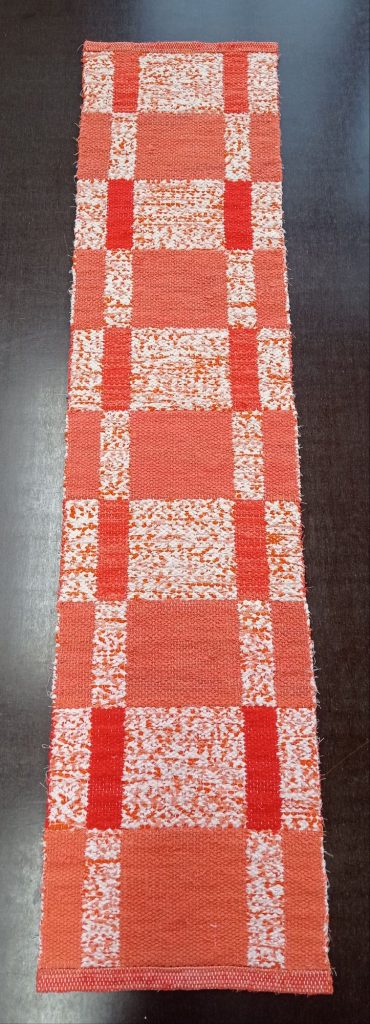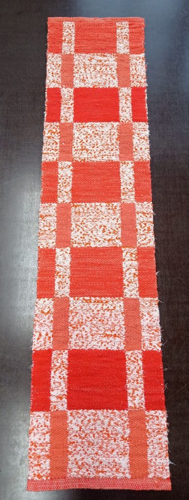 Valmiissa matossa on kaksi puolta, vasemman puoleinen on hieman kirkkaampi ja oikean puolen on vähän hillitympi. Pesin maton jotta se saatiin kutistettua oikeaan kokoon. Koko ennen pesua oli 170cm x 38,5cm ja pesun jälkeen 155cm x 36cm. Kutistumisen kanssa oli paljon haasteita koska olin vahingossa kadottanut mitat joiden mukaan se olisi pitänyt laskea. Onneksi matosta tuli kuitenkin loppujen lopulta juuri oikean mittainen. Minulla on tapana onnistua välillä ihan vahingossa.
