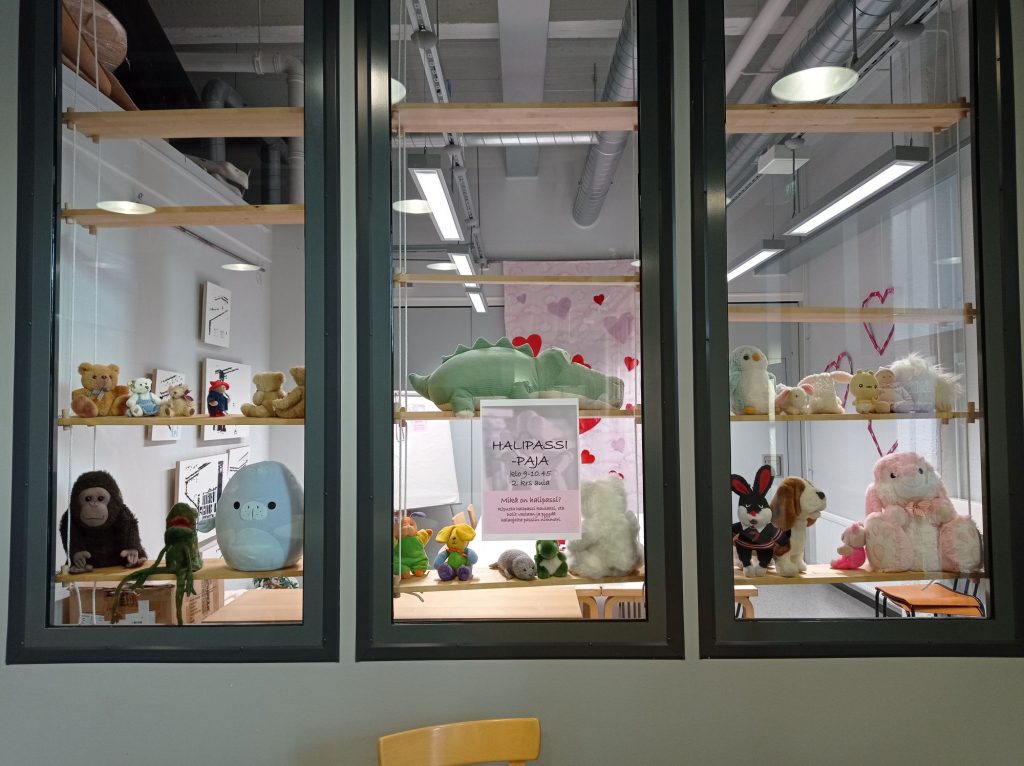 Asiakaspalvelutilan ikkunan koristelimme pehmoleluilla <3Opiskelijoita työn touhussa