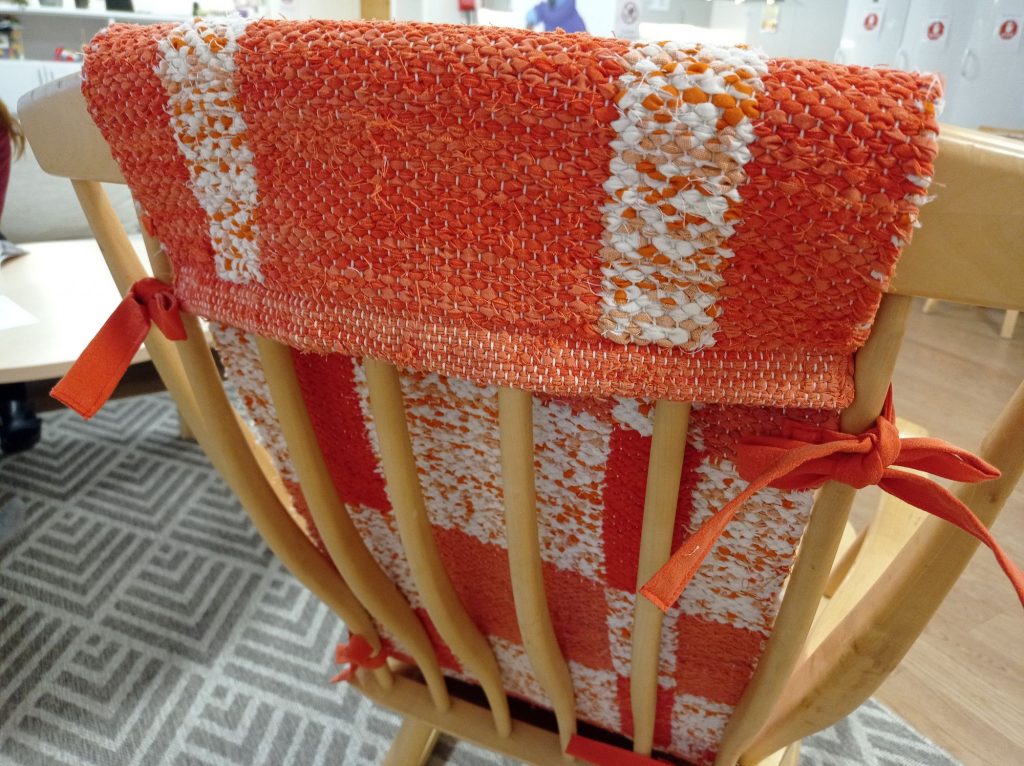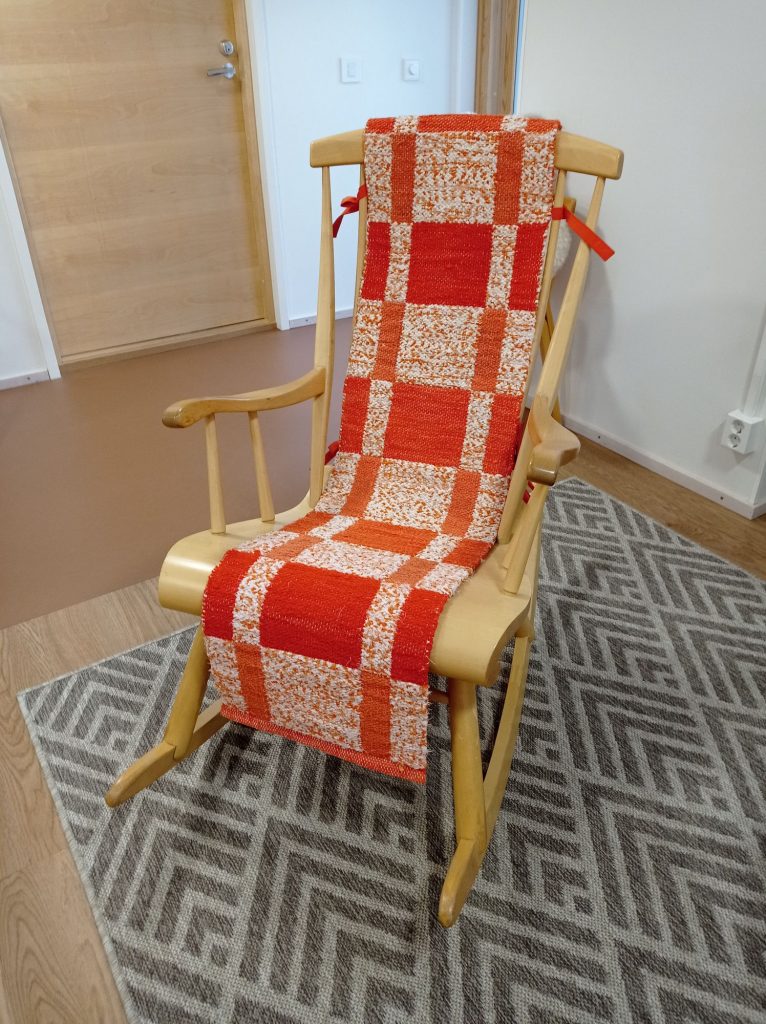 Sain asiakkaakseni Ensi- ja turvakodin ja teen heille keinutuolin maton kutoen. Olin heihin yhteydessä puhelimitse ja sain tarvittavia tietoja kuten mitat, värit, materiaali ja budjetti