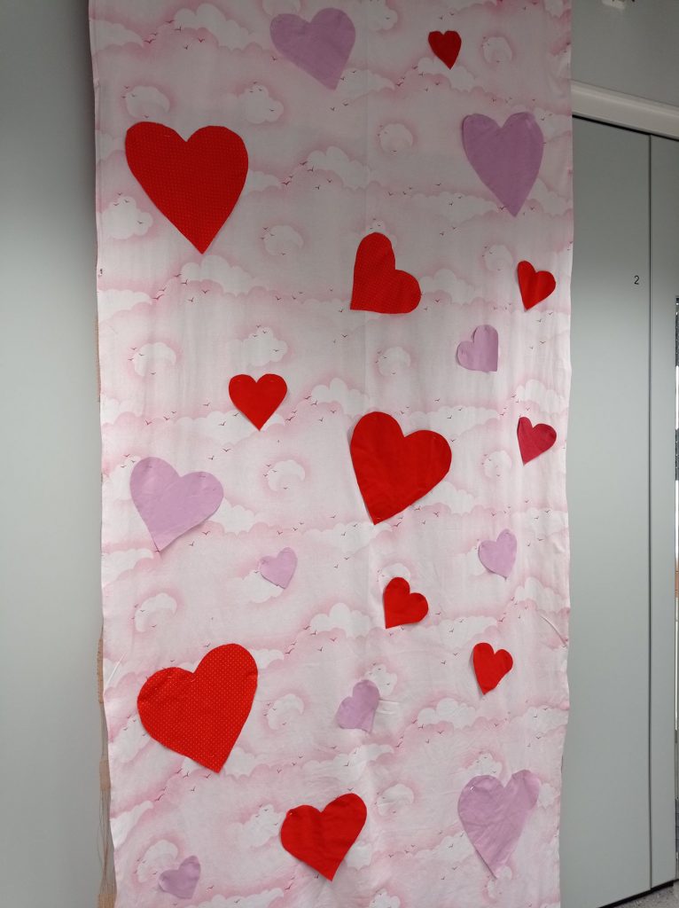 Seinävaatteen valmistimme vanhasta lakanasta ja tilkkukankaista leikatuista sydämistä. Kiinnitimme sydämet nuppineuloilla.