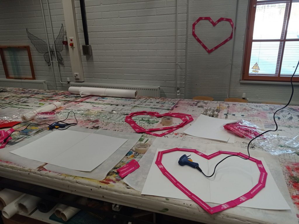 Kuumaliimasimme palat yhteensydämistä tuli kauniita ja ne oli nopea tehdäTyötilasta tuli ihanan tunnelmallinen, kun saimme kaikki koristeet ja tavarat paikoilleen. Seinävaatteesta tuli juuri sopiva.